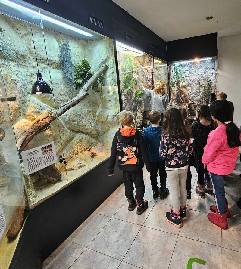 „Świat gadów” to połączenie kopalnych z żyjącymi współcześnie zwierzętami. Tą interesującą gromadę zwierząt zaprezentowano w kilku modułach wystawowych, w podziale na obszary występowania, w scenerii znakomicie oddającej ich środowisko naturalne. Zobaczyć można gadzich rekordzistów - anakondę zieloną Eunectes murinus (dermoplast), uznaną za najgrubszego węża świata oraz pytona siatkowego Python reticulatus (dermoplast) - najdłuższego węża na świecie. Wśród gadów kopalnych na szczególną uwagę zasługuje niezwykle cenny okaz 1,5 metrowej czaszki krokodyla kredowego z rodzaju Steneosaurus. Dopełnieniem wystawy jest część edukacyjna, gdzie można dowiedzieć się jak zbudowana jest skóra gadów, jak wygląda wylinka węża, skorupa żółwia lamparciego czy jajko żółwia. Na wystawie zaprezentowano także terraria z żywymi gadami: agamą błotną Physignathus cocincinus, agamą brodatą Pogona vitticeps, gekonami orzęsionymi Correlophus ciliatus, anolisami zielonymi Anolis carolinensis oraz scynkami berberyjskimi Eumeces schneideri.